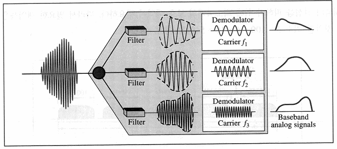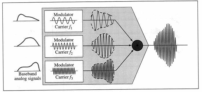 이 유사한 신호들은 다중화기 내부에서 다른 반송 주파수로 변조된다(f1, f2, f3).