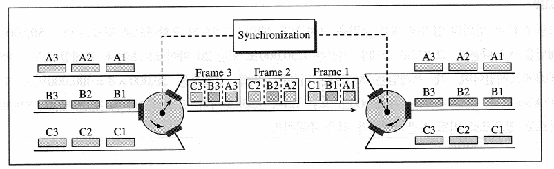 동기 TDM에서는 각 입력 회선은 출력 프레임에 예약된 슬롯을 가지고 있다.