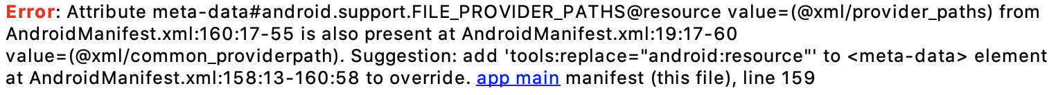 Manifest 파일에 추가한 Provider가 이미 정의되어 있어 충돌이 발생한 오류로, 해당 부분을 제거하여 해결하였습니다.