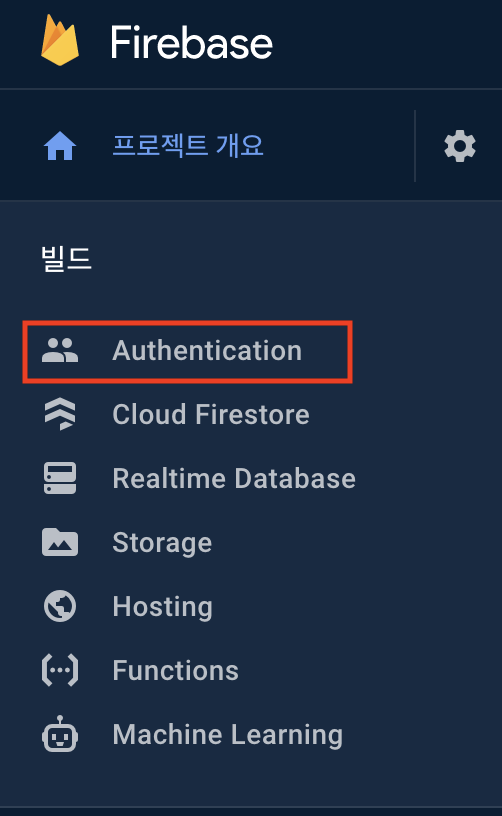 2-1) firebase.google.com/ 페이지에서 해당 프로젝트로 들어가서 좌측의 Authentication 메뉴로 들어간다.