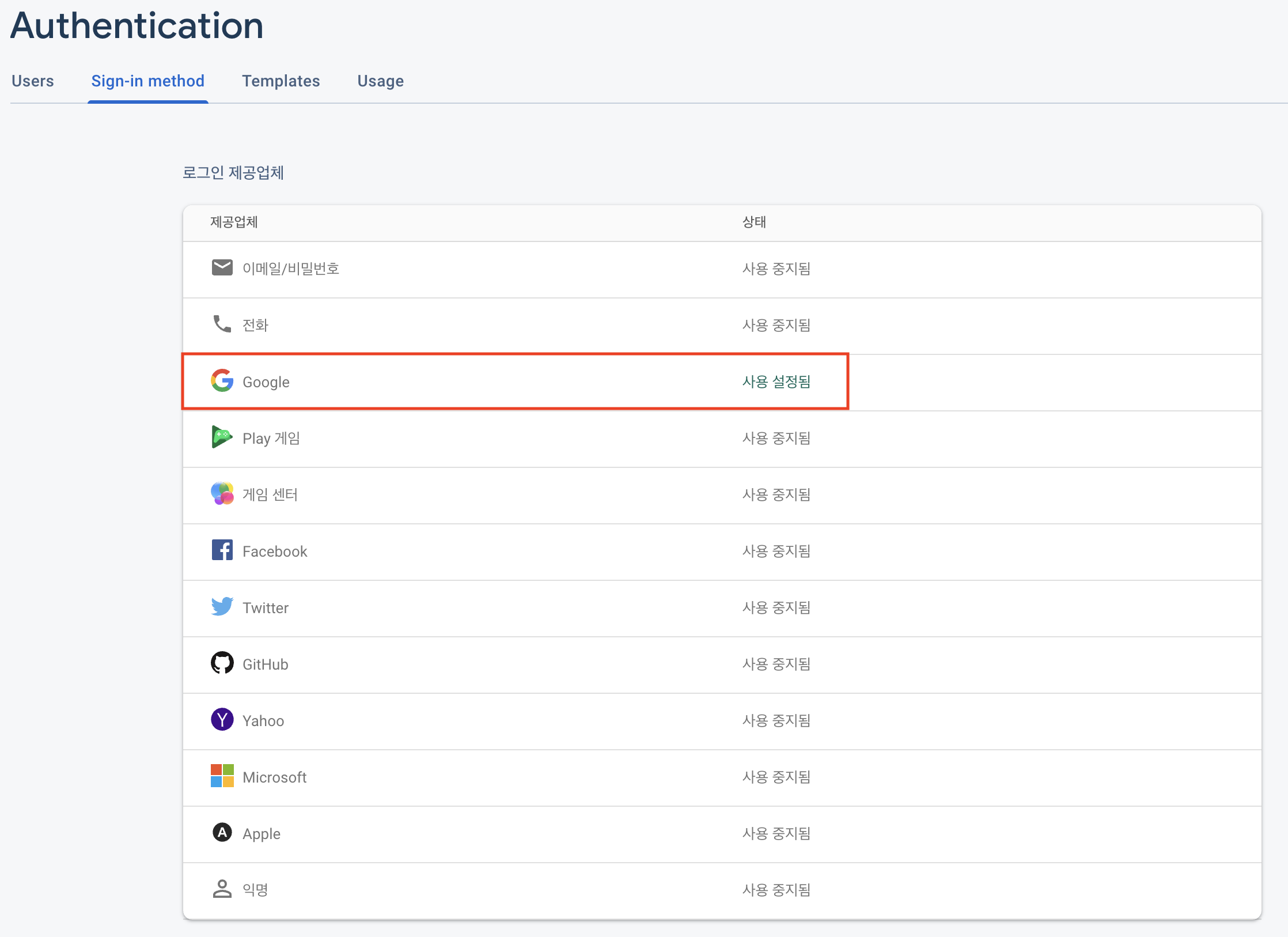 2-2) Sign-in method 탭에서 Google을 클릭하여 사용 설정기능을 On 시켜준다.