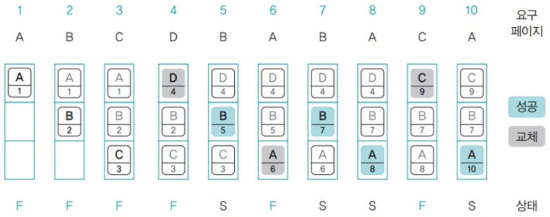 아래 4번을 보면 D를 넣기 위해 앞으로 사용할 페이지에 A, B, C가 있는지 본다.