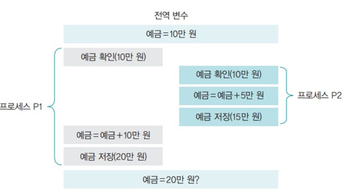위의 예로 보면 P1과 P2는 동시에 예금에 10만원이 있는 것을 확인한 후 작업을 시작했다.