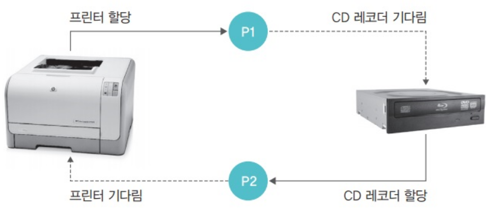 예로 P1은 프린터를 할당받은 후 CD 레코더를 기다리고,