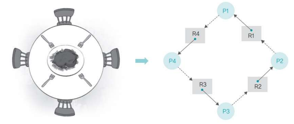 | 3. 각 철학자는 왼쪽 포크를 잡은 채 오른쪽 포크를 기다린다. | 자원 하나를 잡은 상태에서 다른 자원을 기다린다. |