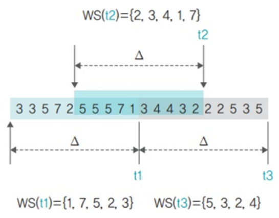 이때 작업집합 윈도우에는 현재 시점(t1)부터 시간적으로 가까운 페이지부터 삽입된다.