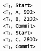 예로, 트랜잭션 T1과 T2는 <T1, T2> 순으로 실행되고 로그는 아래와 같다.